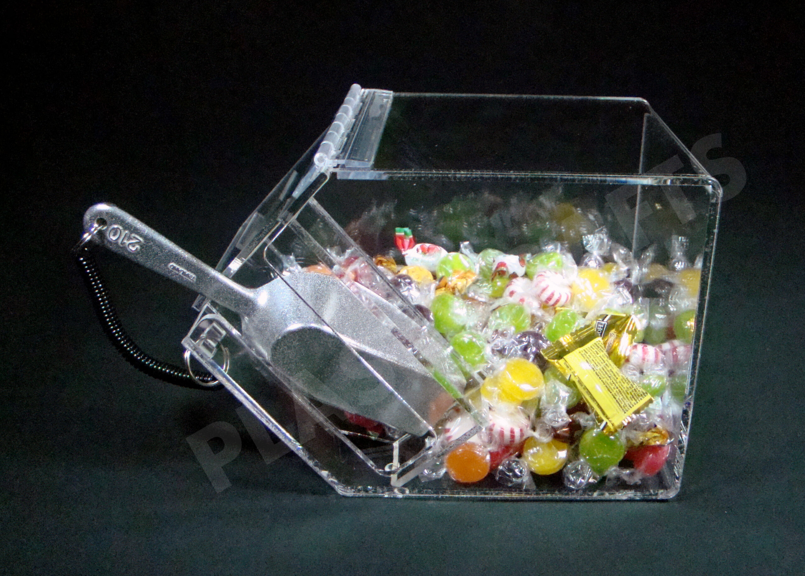 This stacking candy bin is made from 3/16″ thick clear acrylic/plexiglass. Manufactured in Redford, MI USA. This bin holds approximately 5 lbs. of candy.