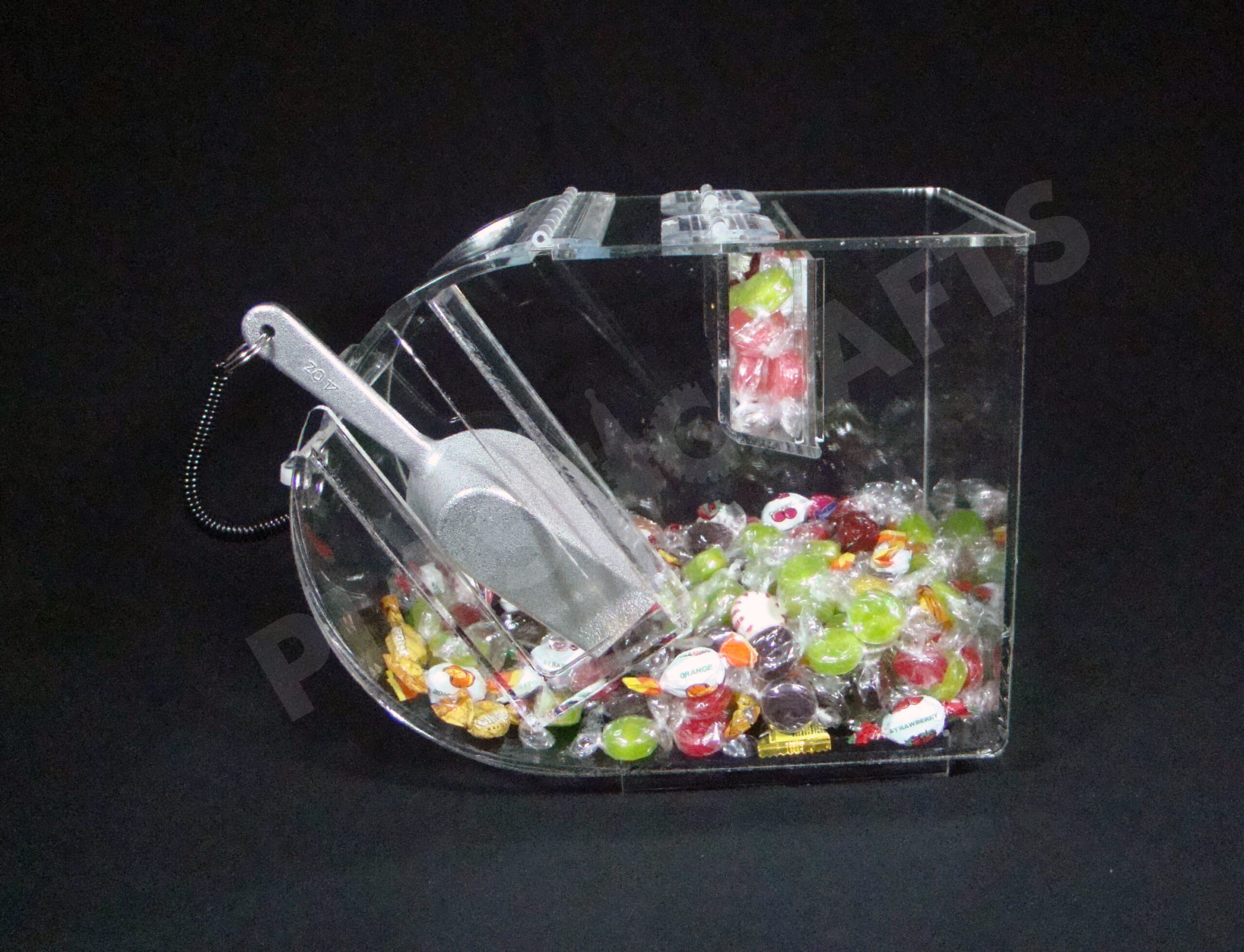 This candy bin is made from 3/16″ thick clear acrylic/plexiglass. Manufactured in Redford, MI USA. This bin holds approximately 10 lbs. of candy.