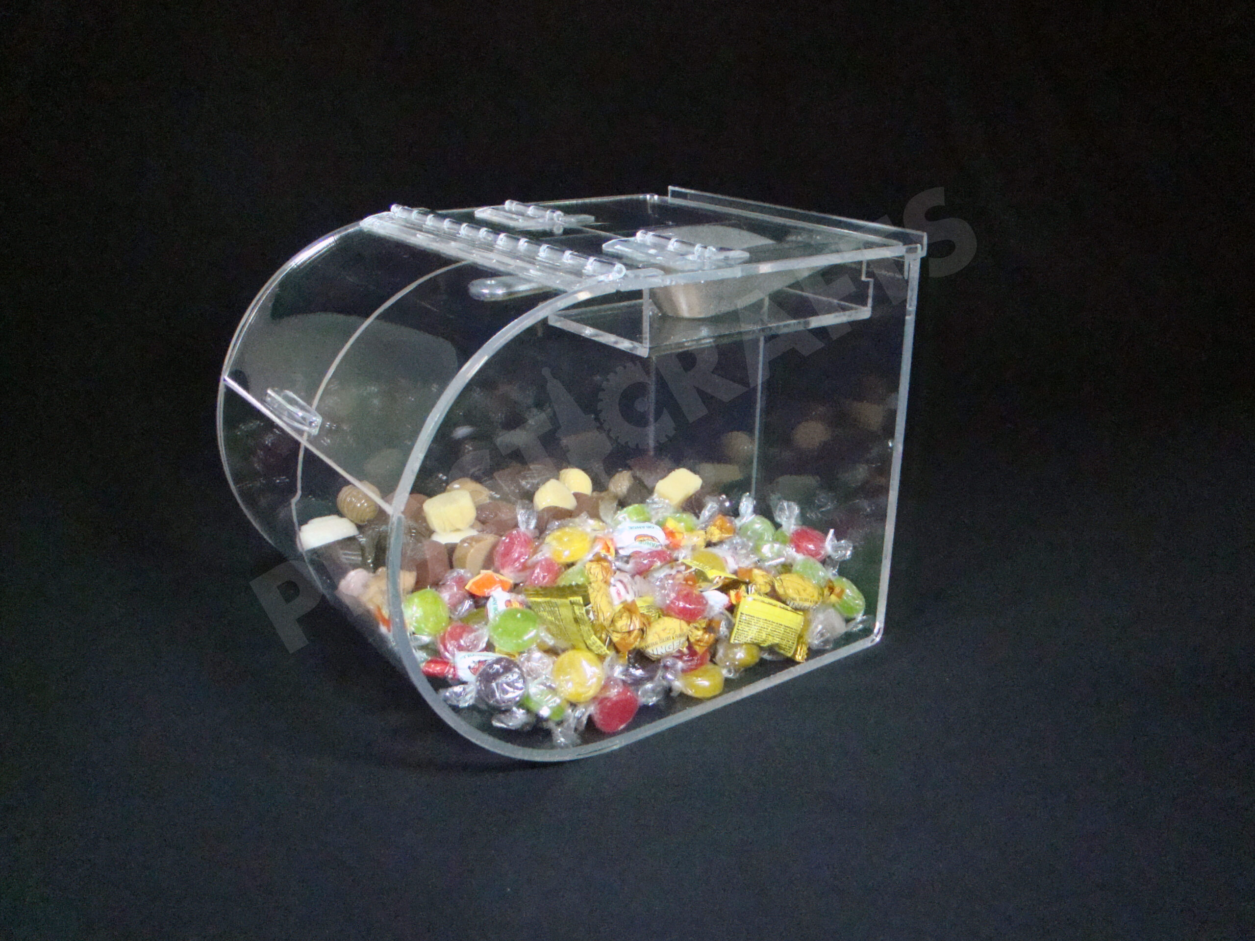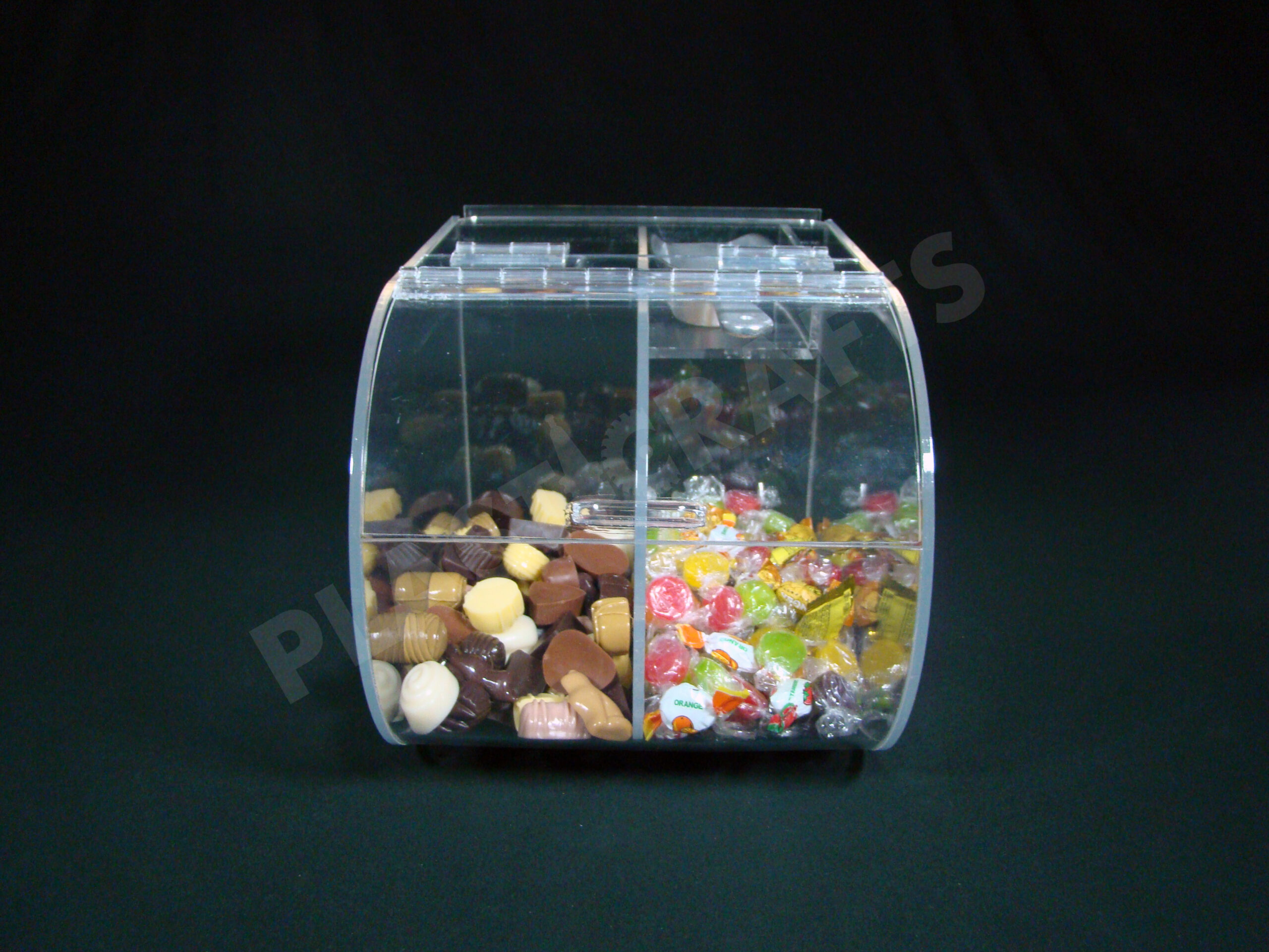 This divided candy bin is made from 3/16″ thick clear acrylic/plexiglass. Manufactured in Redford, MI USA. This bin holds approximately 6 lbs. of candy.