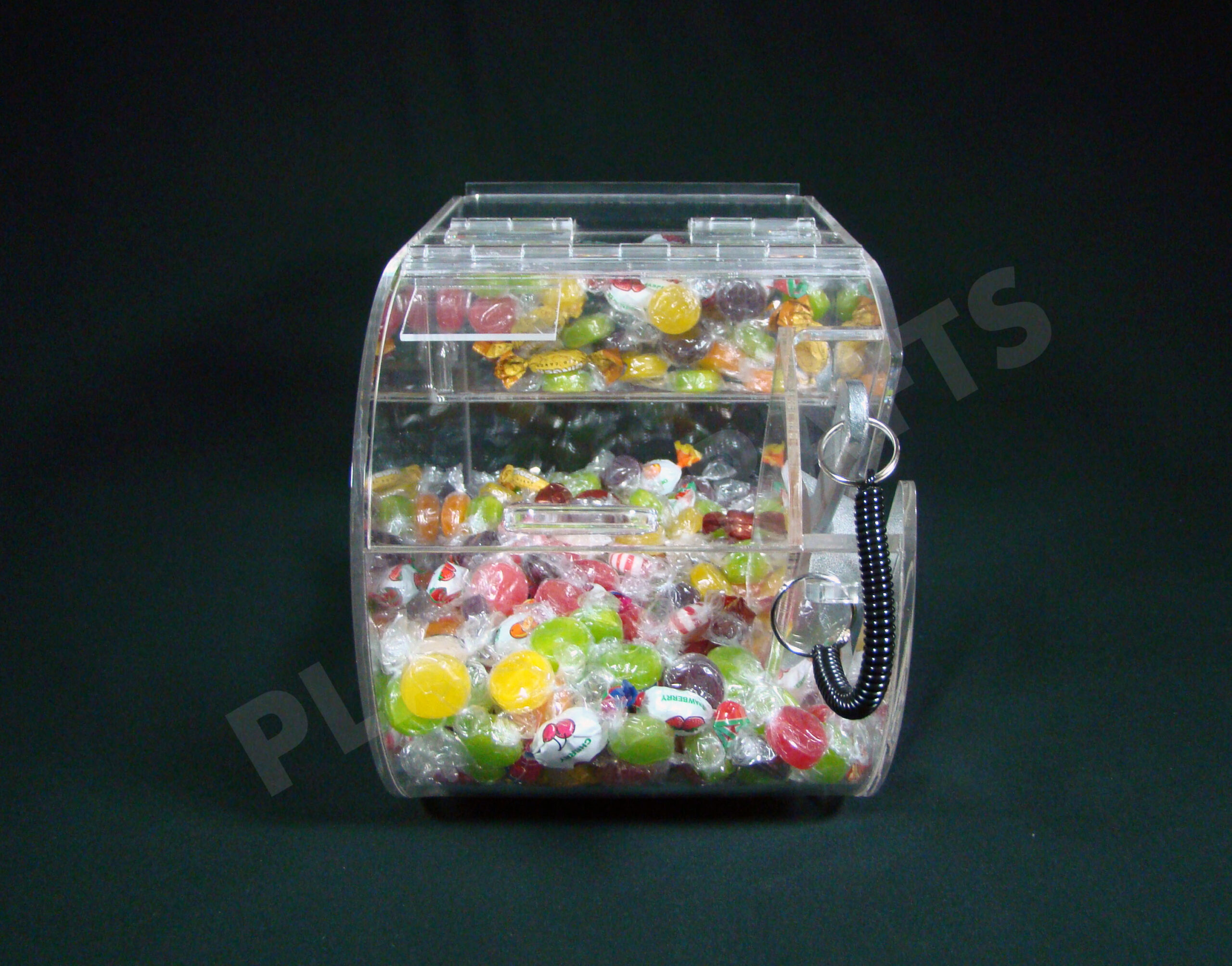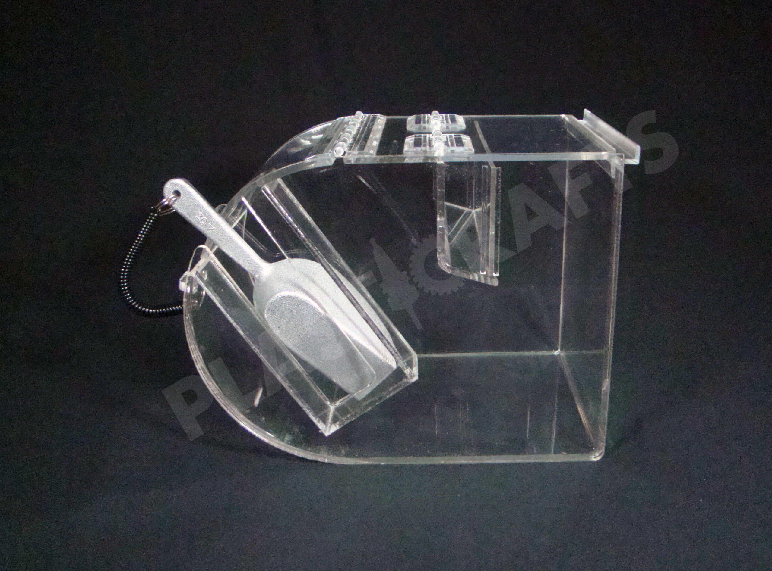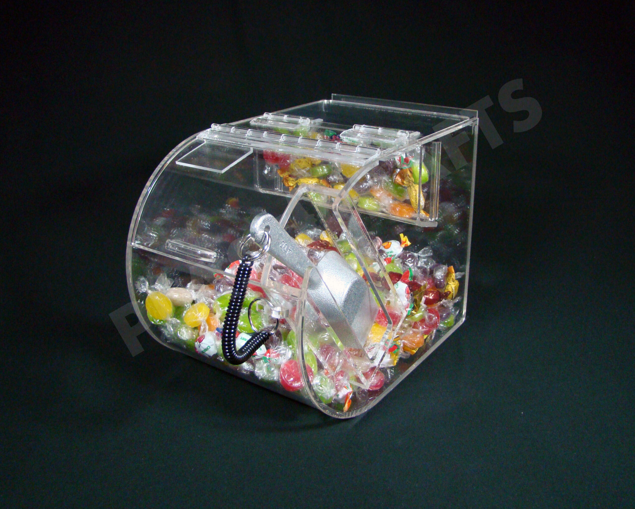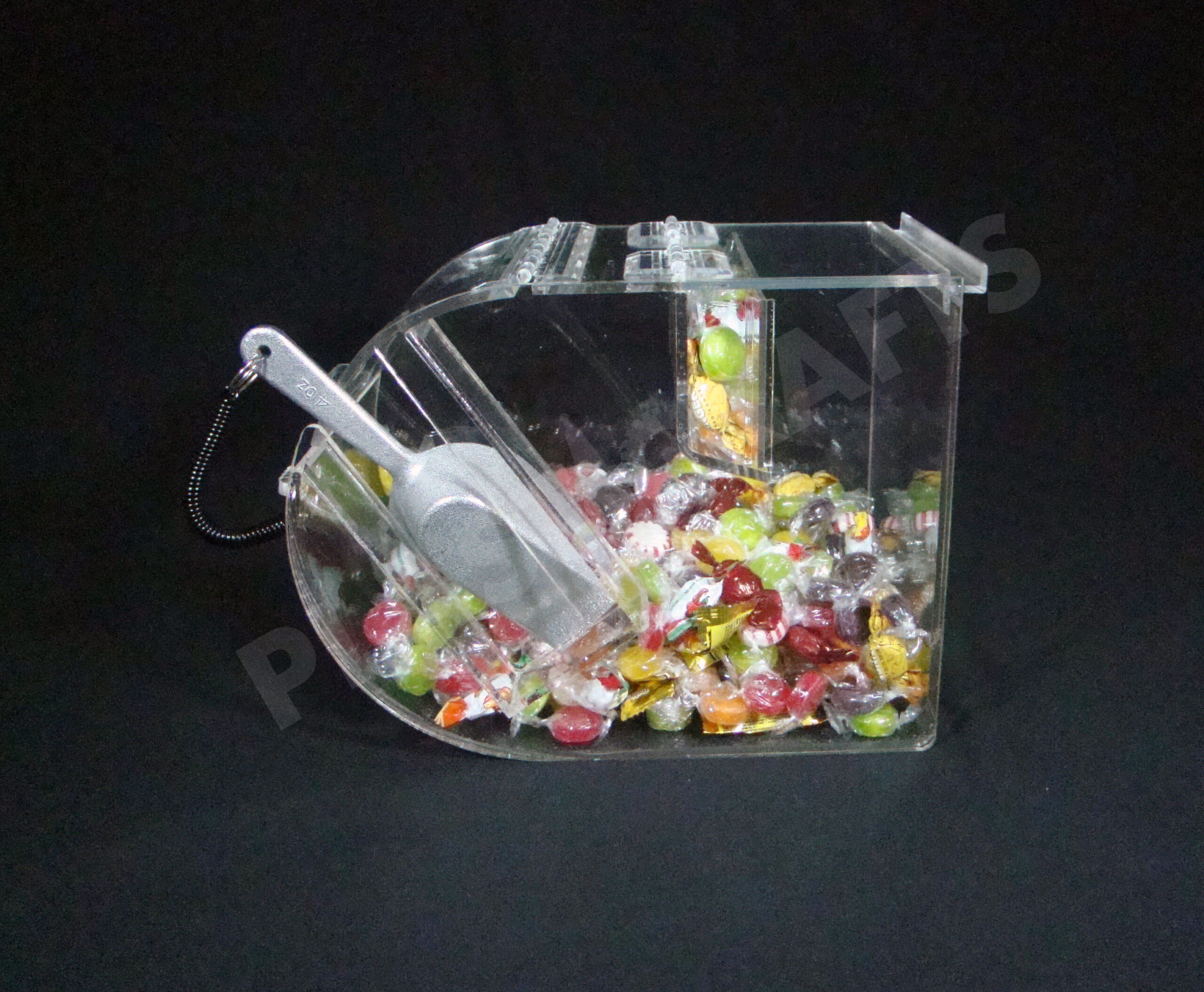This candy bin is made from 3/16″ thick clear acrylic/plexiglass. Manufactured in Redford, MI USA. This bin holds approximately 5 lbs. of candy.