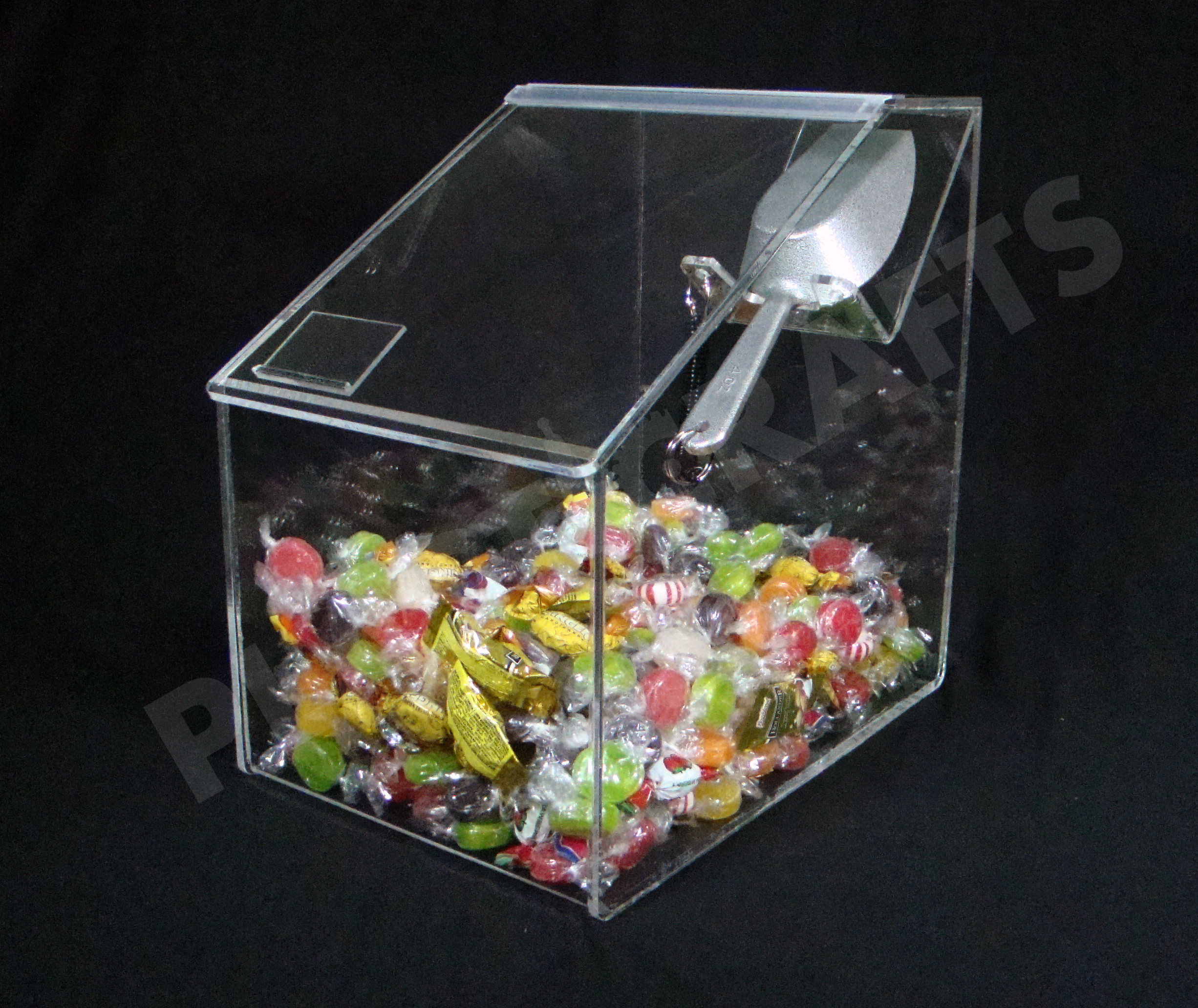 This candy bin is made from 3/16″ thick clear acrylic. We use top of the line plastic to manufacture these bins in Redford, MI USA. This bin holds approximately 17 lbs. of candy.