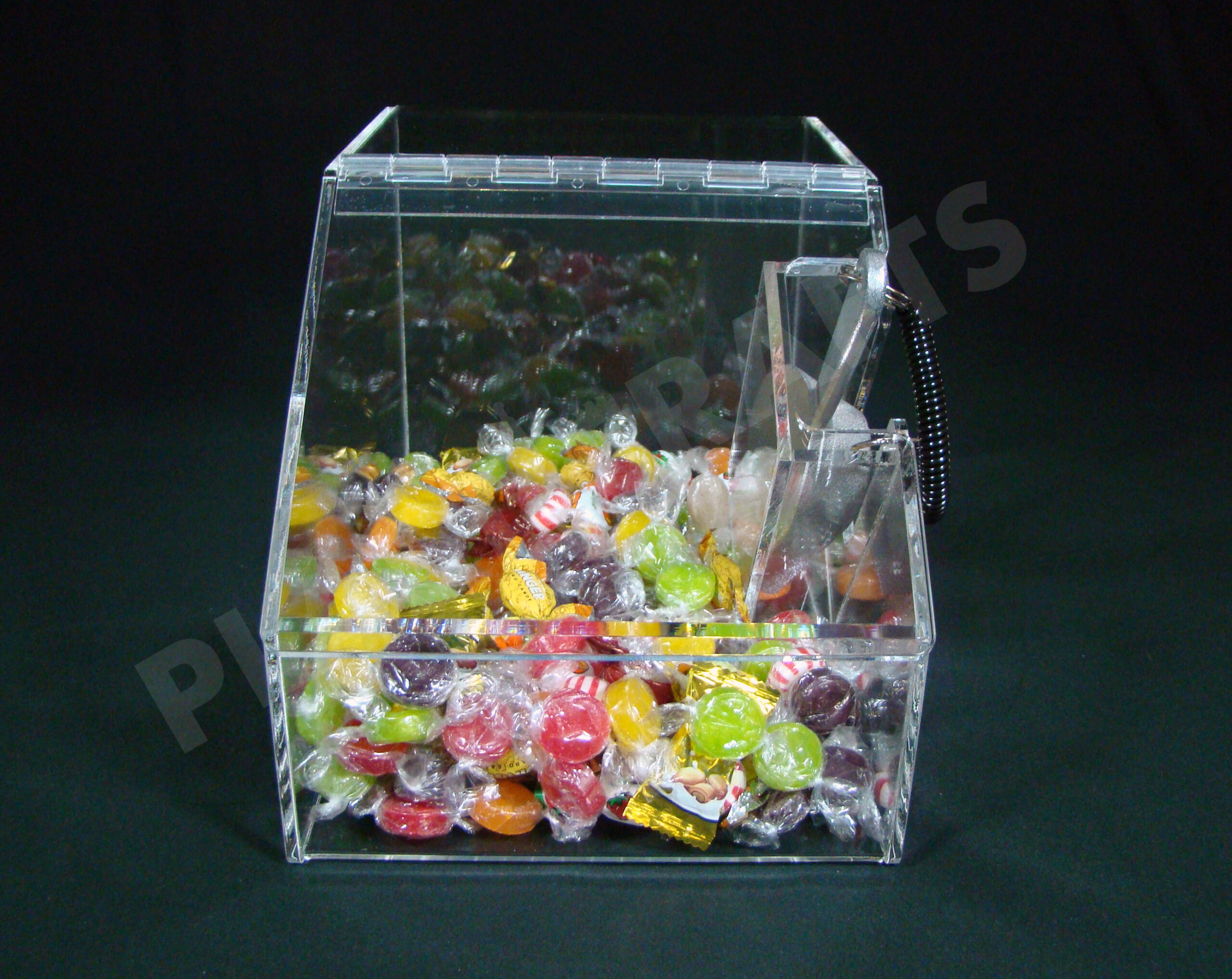 This candy bin is made from 3/16″ thick clear acrylic. We use top of the line plastic to manufacture these bins in Redford, MI USA. This bin holds approximately 10 lbs. of candy.