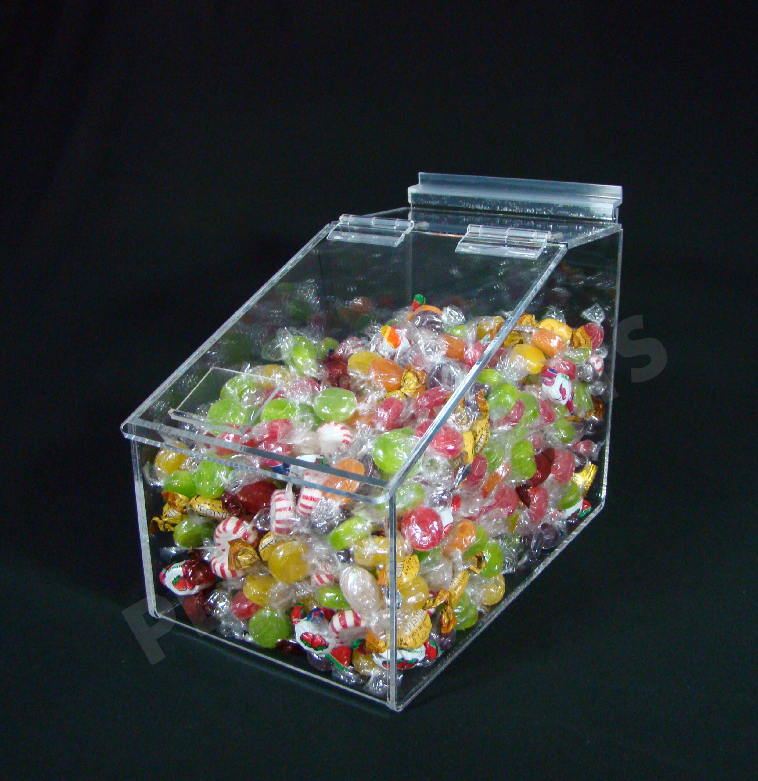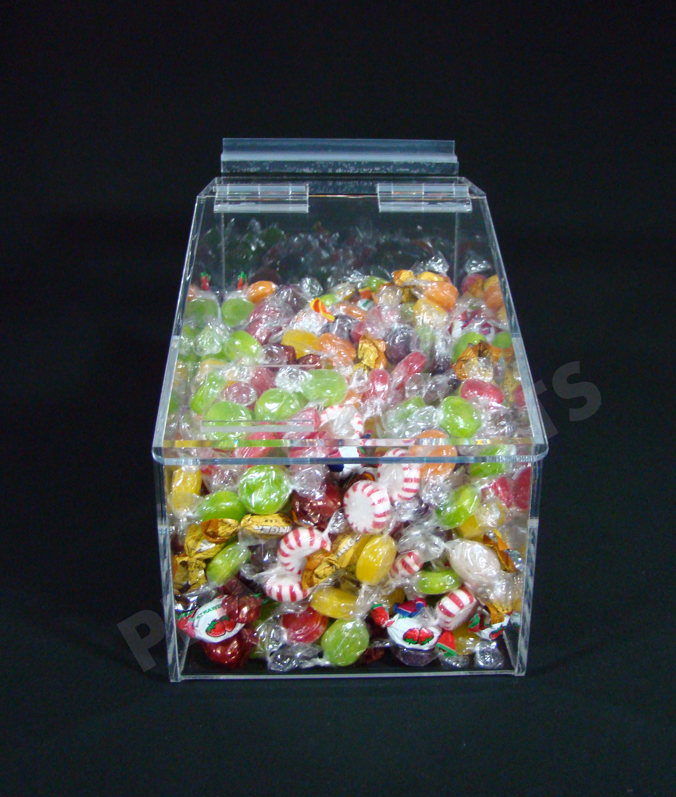 This candy bin is made from 3/16″ thick clear acrylic. We use top of the line plastic to manufacture these bins in Redford, MI USA. This bin holds approximately 5 lbs. of candy.